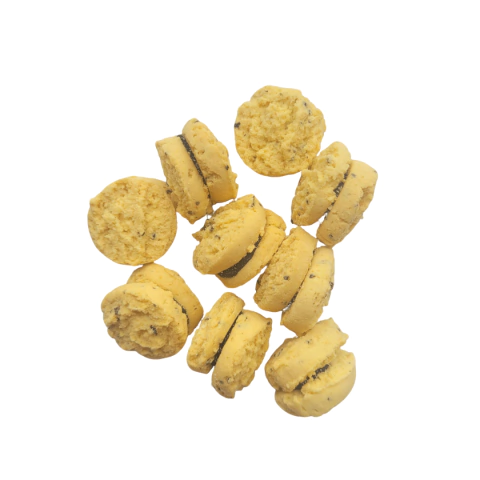 Ingredientes: amido de milho, farinha de arroz, maracujá, polidextrose, gordura de palma, açúcar demerara,cacau em pó, óleo de coco, sal rosa do himalaia, fermento em pó, cúrcuma, manteiga de cacau, leite de coco em pó, cúrcuma.